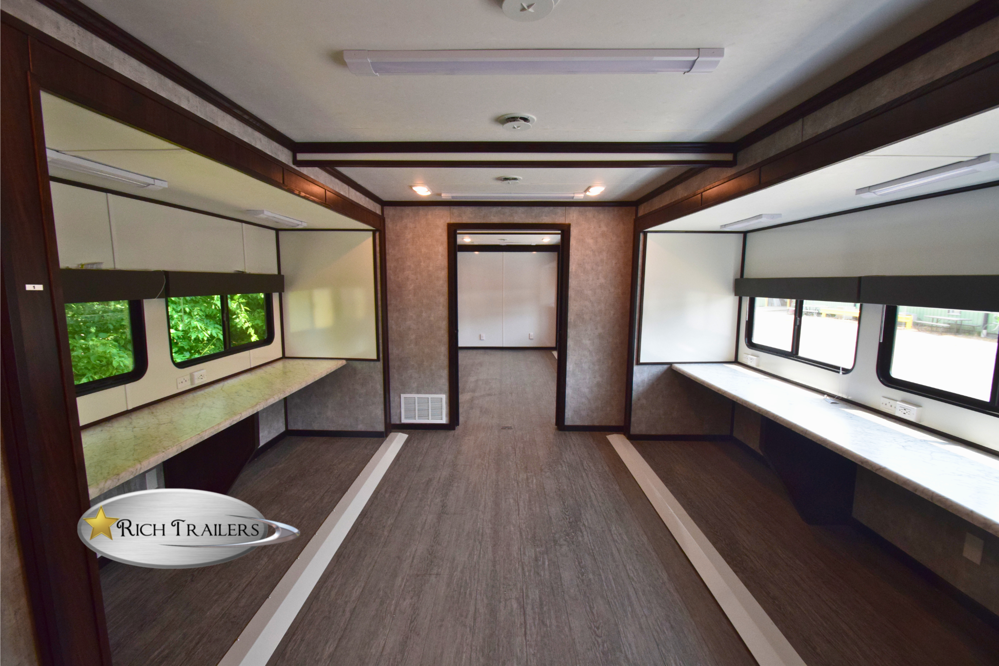 The BH8536 Command Trailer is designed to optimize productivity with a variety of built-in features. Each workstation includes a CAT Ethernet connection, allowing for seamless networking of all computers. Phone jacks at each station ensure reliable on-site phone service, while strategically placed electrical outlets provide easy access to power for all necessary equipment. By combining a well-thought-out layout with essential features, the BH8536 Command Trailer stands out as a highly functional mobile office solution, ideal for businesses seeking efficiency in dynamic work environments.