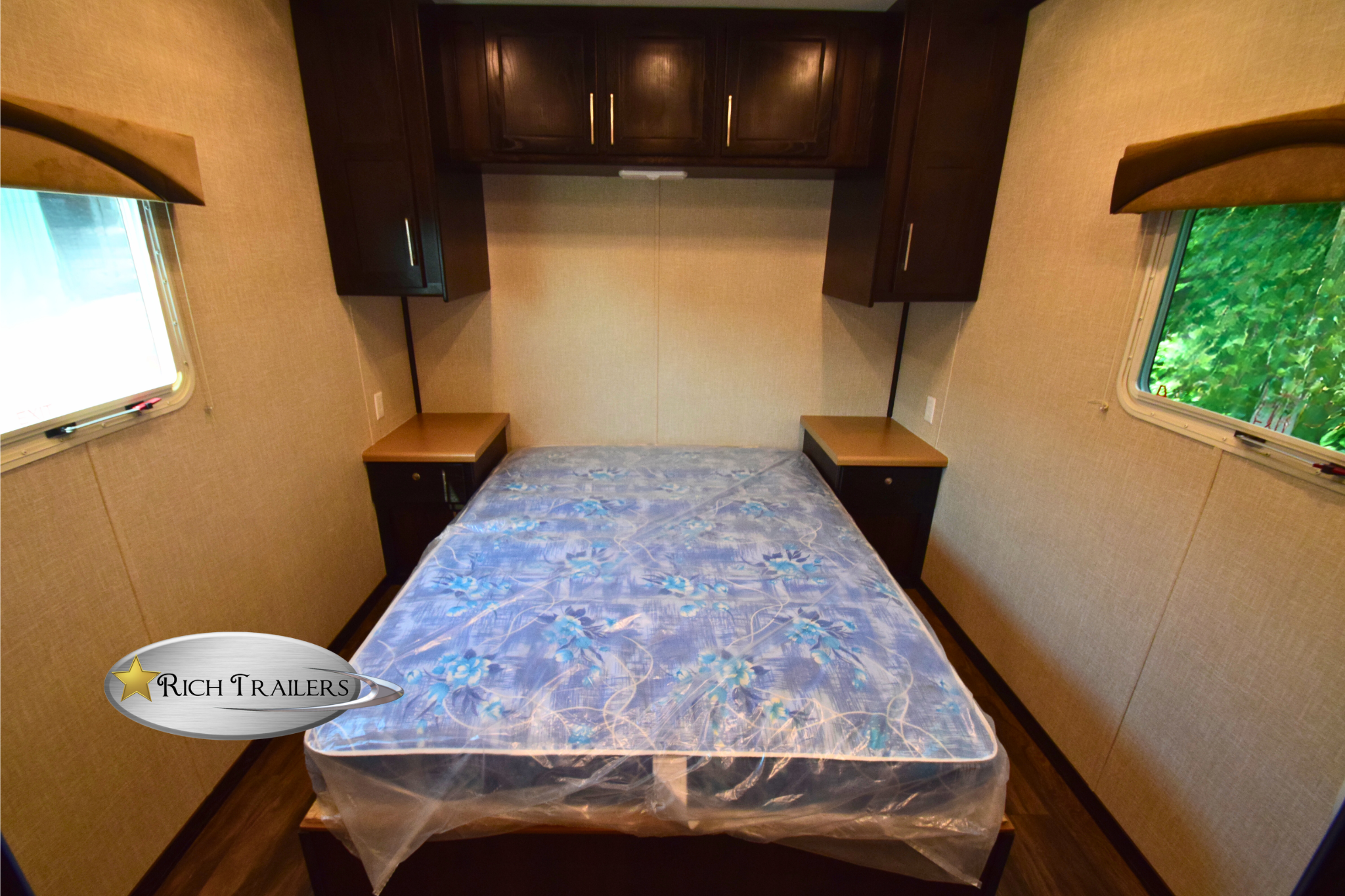 The bedroom offers exceptional comfort with an innerspring mattress, ample storage, and LED lighting. Wardrobe and overhead cabinets maximize space, while nightstands offer extra storage by the bed. Electrical outlets and a TV jack create a versatile space for rest and relaxation. Under-bed storage provides additional room for bedding or personal items, ensuring supervisors have everything they need for extended stays on-site.