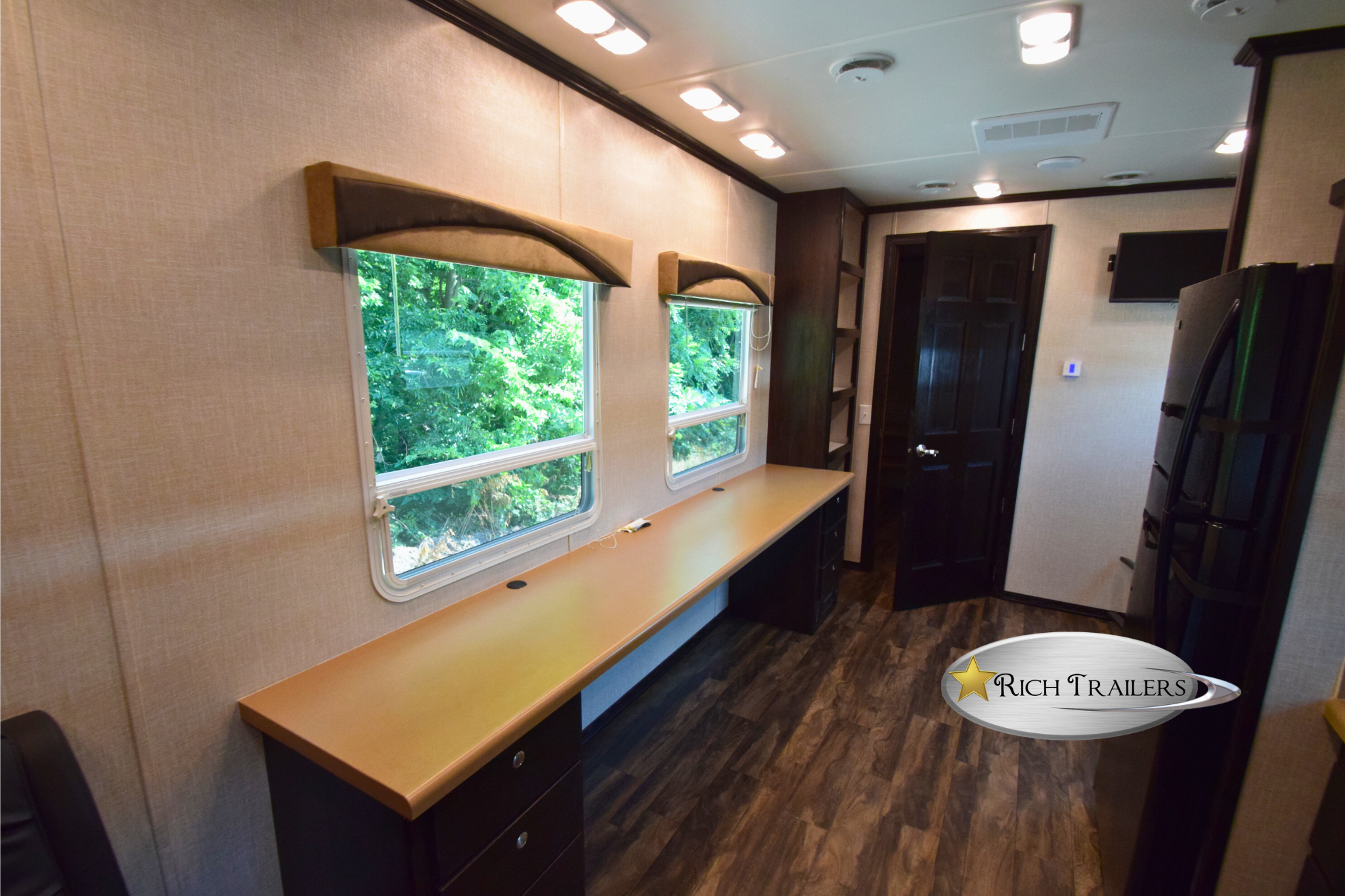 Each oil field supervisor trailer includes a well-equipped kitchen with either an electric or gas cooktop, a microwave, and a spacious residential refrigerator. Custom Amish-crafted cabinets with hardwood doors and drawers offer ample storage. Additional features include a durable rolled-edge laminate countertop, a black faux leather lounge sofa, and a desk work area complete with a stereo and iPhone player. A large window provides visibility to the surrounding work area, allowing supervisors to stay connected to site activity.