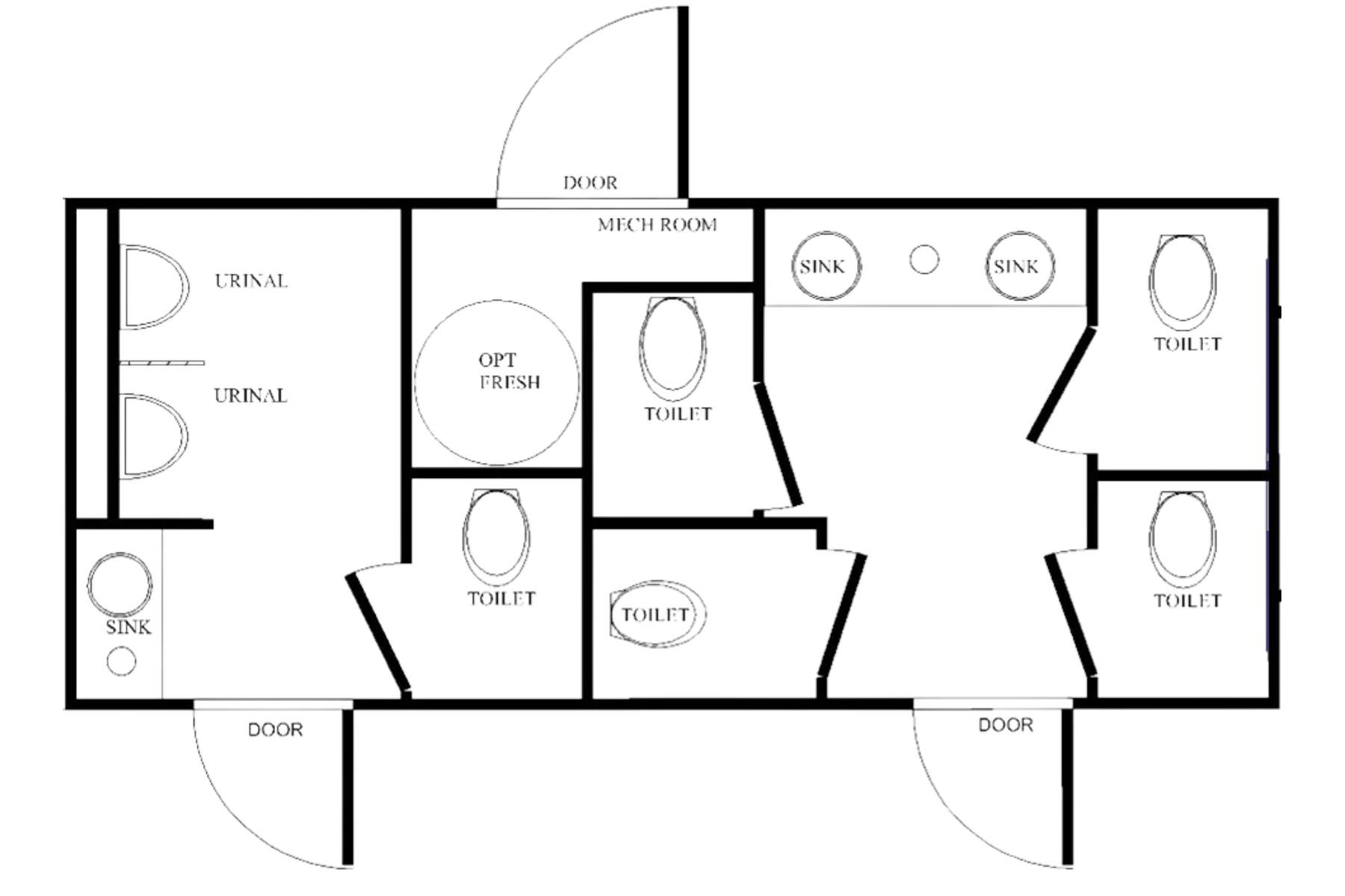 The seven-station restroom trailer offers a balanced, efficient design for medium to large gatherings, measuring a compact 19 feet. This model includes a flexible floor plan with four women’s stalls and three men’s stations. For male-dominant use, the plan can reverse to provide four men’s and three women’s stations. Engineered with oversized tandem axles and 16-inch radial tires, the seven-station restroom trailer model tows smoothly, even across various terrains.